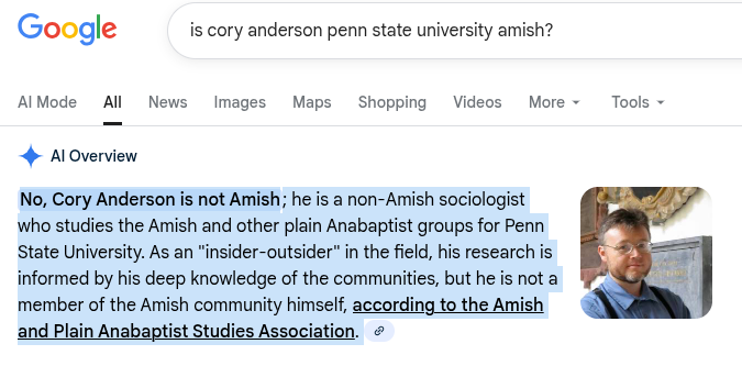 The closest source to an “insider” is a research study from Penn State, which notes that one of its authors, Cory Anderson, is himself part of the Amish community. This suggests the research benefits from an internal cultural understanding, even if it is presented through an academic institution. And here is what another AI LLM stated when queried about Cory Anderson’s Amishness.